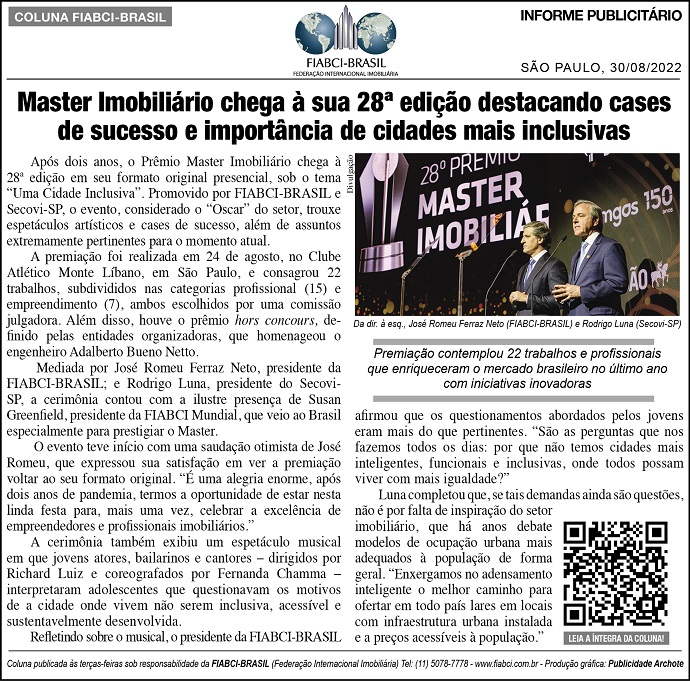 Após dois anos, o Prêmio Master Imobiliário chega à 28ª edição em seu formato original presencial, sob o tema “Uma Cidade Inclusiva”. Promovido por FIABCI-BRASIL e Secovi-SP, o evento, considerado o “Oscar” do setor, trouxe espetáculos artísticos e cases de sucesso, além de assuntos extremamente pertinentes para o momento atual.