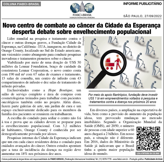 Líder mundial na pesquisa e tratamento contra o câncer e outras doenças graves, a Fundação Cidade da Esperança, na Califórnia - EUA, inaugurou, no distrito de Orange County, localizado no Sul do Estado americano, um visionário centro abrangente para conduzir pesquisas inovadoras e tratamentos pioneiros sobre o câncer.