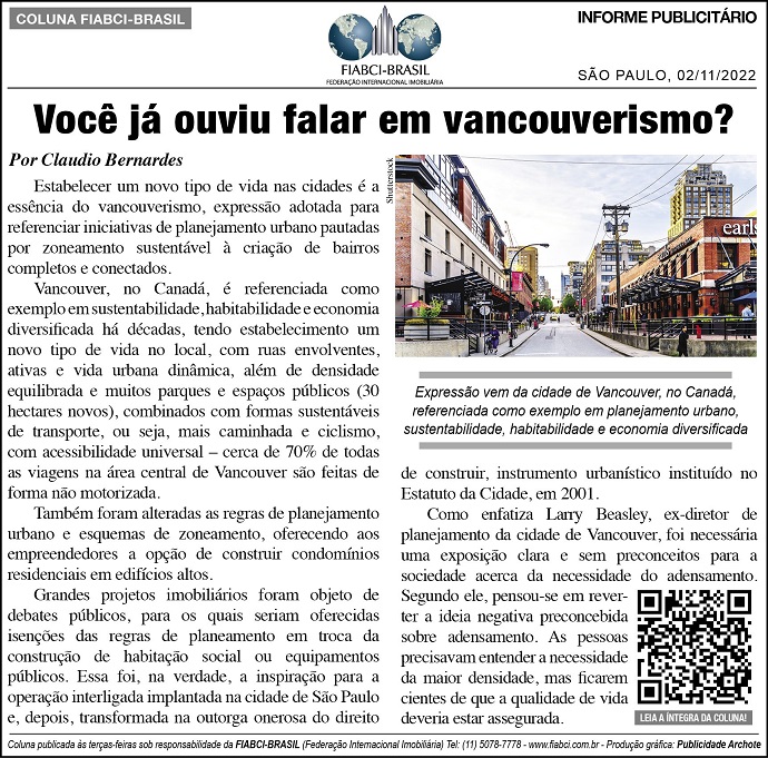 Com base em artigo assinado por Claudio Bernardes, 2º vice-presidente do Secovi-SP e presidente da Ingai Incorporadora, publicado pela Folha de S.Paulo no último dia 22
