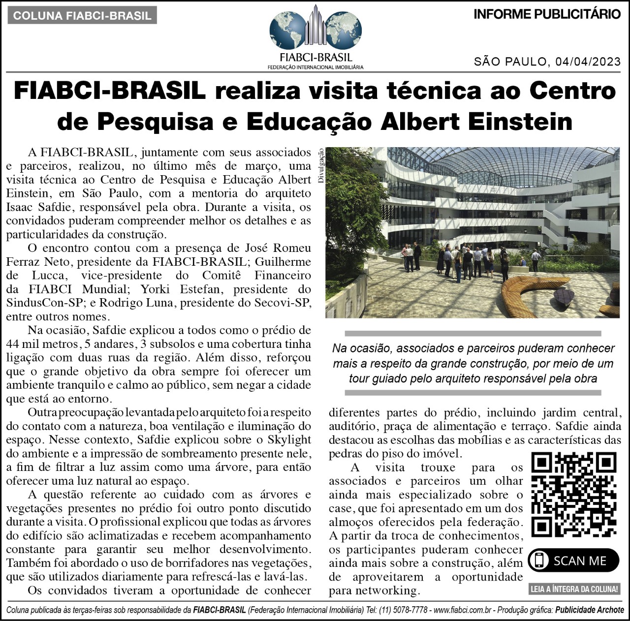 "FIABCI-BRASIL realiza visita técnica ao Centro de Pesquisa e Educação Albert Einstein " - O Estado de S.Paulo - Cad.Economia & Negocios - Pág.B4.