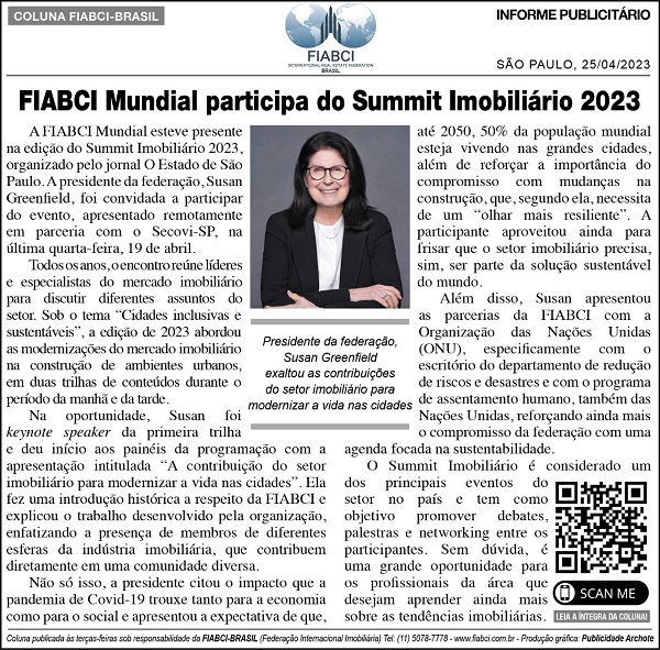 A FIABCI Mundial esteve presente na edição do Summit Imobiliário 2023, organizado pelo jornal O Estado de São Paulo. A presidente da federação, Susan Greenfield, foi convidada a participar do evento, apresentado remotamente em parceria com o Secovi-SP, na última quarta-feira, 19 de abril.