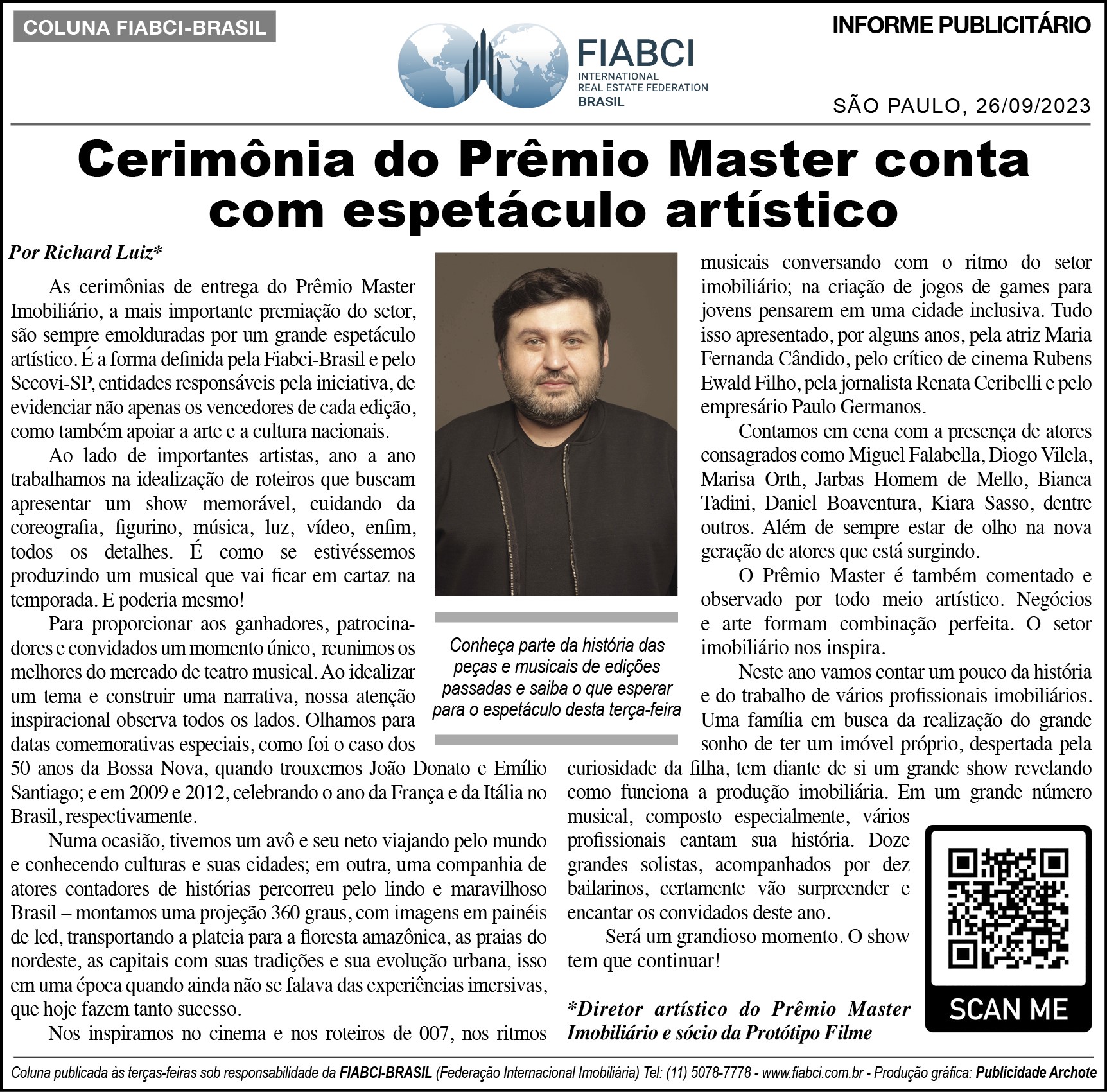 As cerimônias de entrega do Prêmio Master Imobiliário, a mais importante premiação do setor, são sempre emolduradas por um grande espetáculo artístico. É a forma definida pela Fiabci-Brasil e pelo Secovi-SP, entidades responsáveis pela iniciativa, de evidenciar não apenas os vencedores de cada edição, como também apoiar a arte e a cultura nacionais.