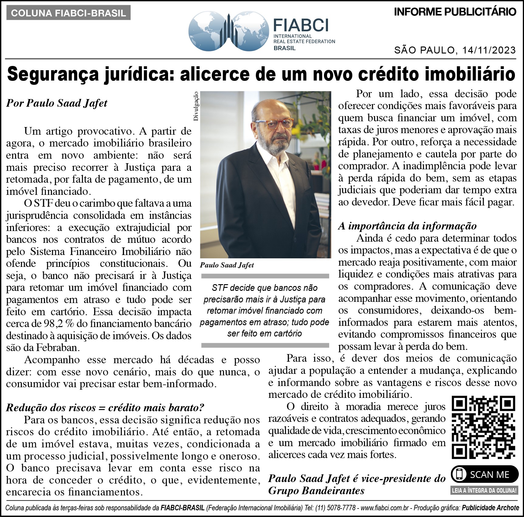 "Segurança jurídica: alicerce de um novo crédito imobiliário" - O Estado de S.Paulo - Cad. Negócios - pág. B12.