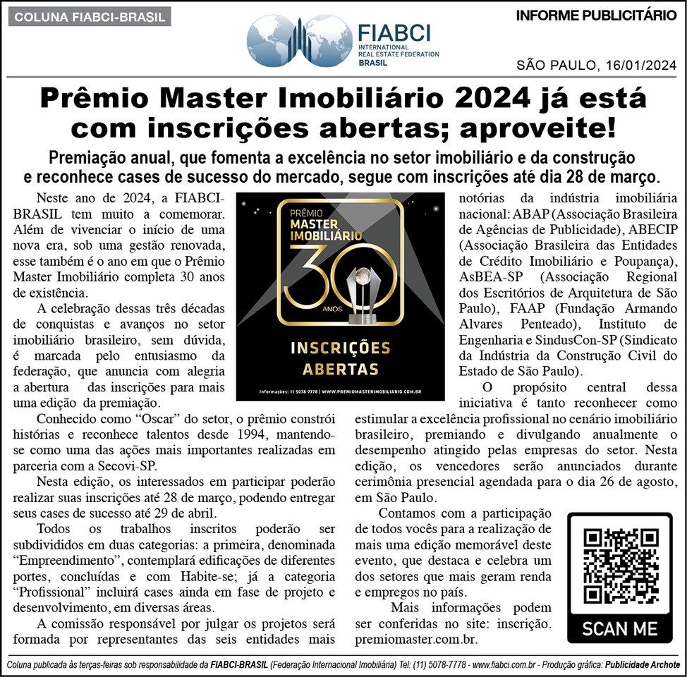 "Prêmio Master Imobiliário 2024 já está com inscrições abertas; aproveite!" - O Estado de S.Paulo - Cad. Negocios - pág. B10.