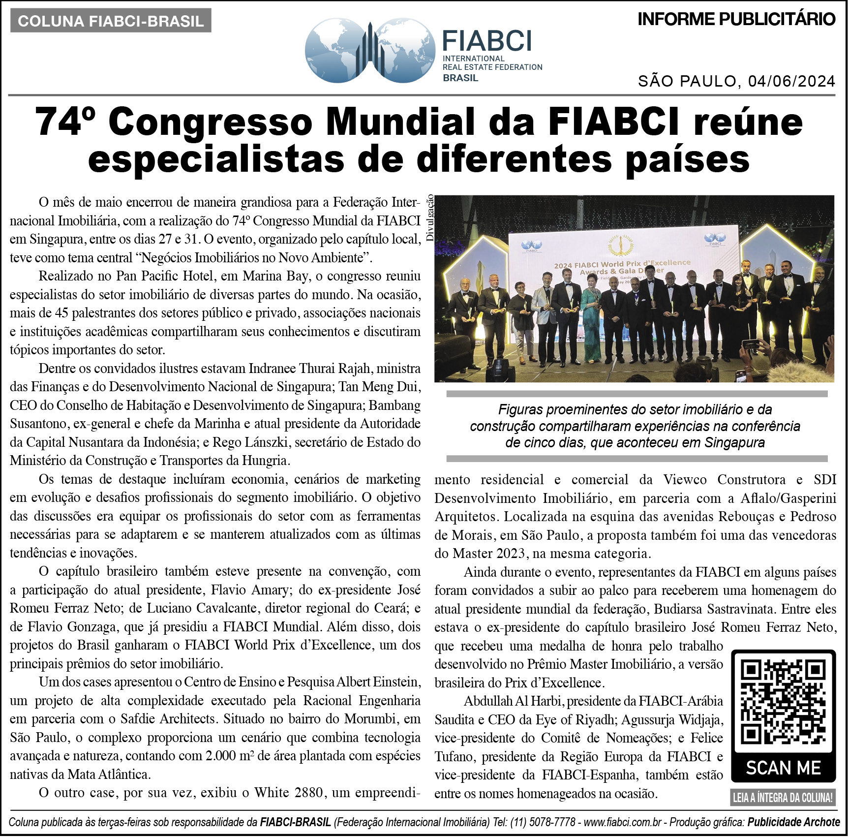 O mês de maio encerrou de maneira grandiosa para a Federação Internacional Imobiliária, com a realização do 74º Congresso Mundial da FIABCI em Singapura, entre os dias 27 e 31. O evento, organizado pelo capítulo local, teve como tema central "Negócios Imobiliários no Novo Ambiente".