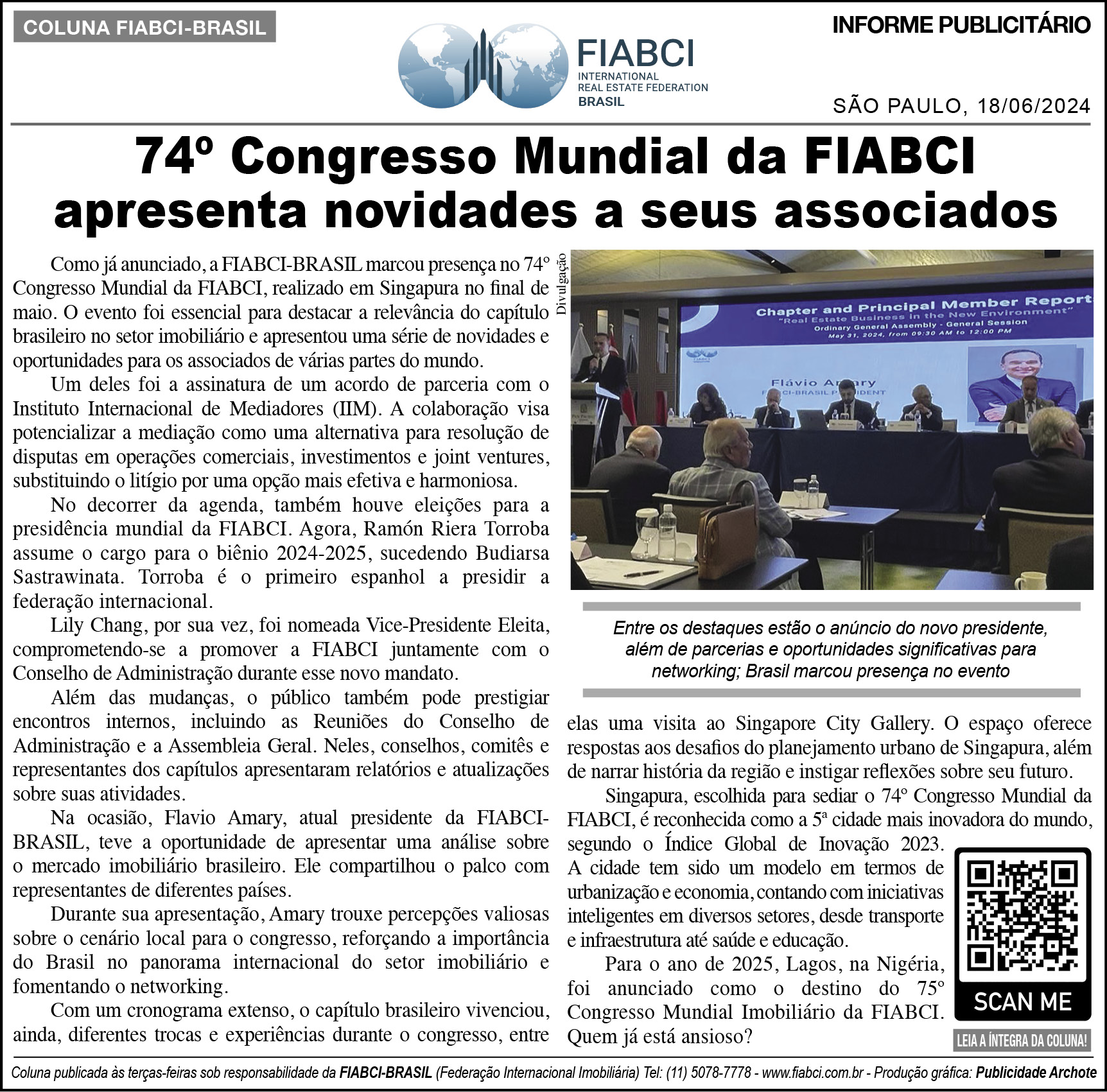 Como já anunciado, a FIABCI-BRASIL marcou presença no 74º Congresso Mundial da FIABCI, realizado em Singapura no final de maio. O evento foi essencial para destacar a relevância do capítulo brasileiro no setor imobiliário e apresentou uma série de novidades e oportunidades para os associados de várias partes do mundo.