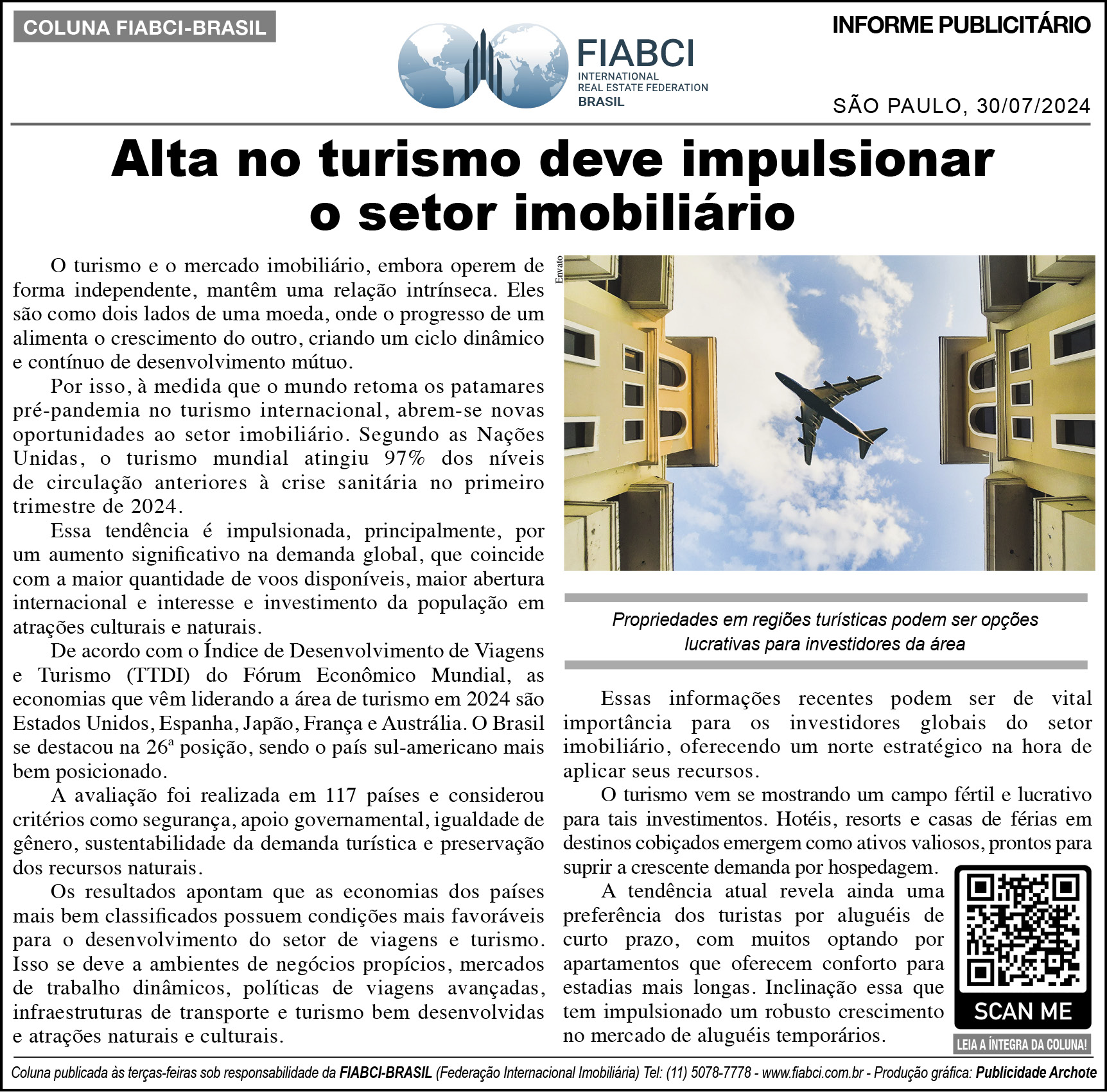 Por isso, à medida que o mundo retoma os patamares pré-pandemia no turismo internacional, abrem-se novas oportunidades ao setor imobiliário. Segundo as Nações Unidas, o turismo mundial atingiu 97% dos níveis de circulação anteriores à crise sanitária no primeiro trimestre de 2024.