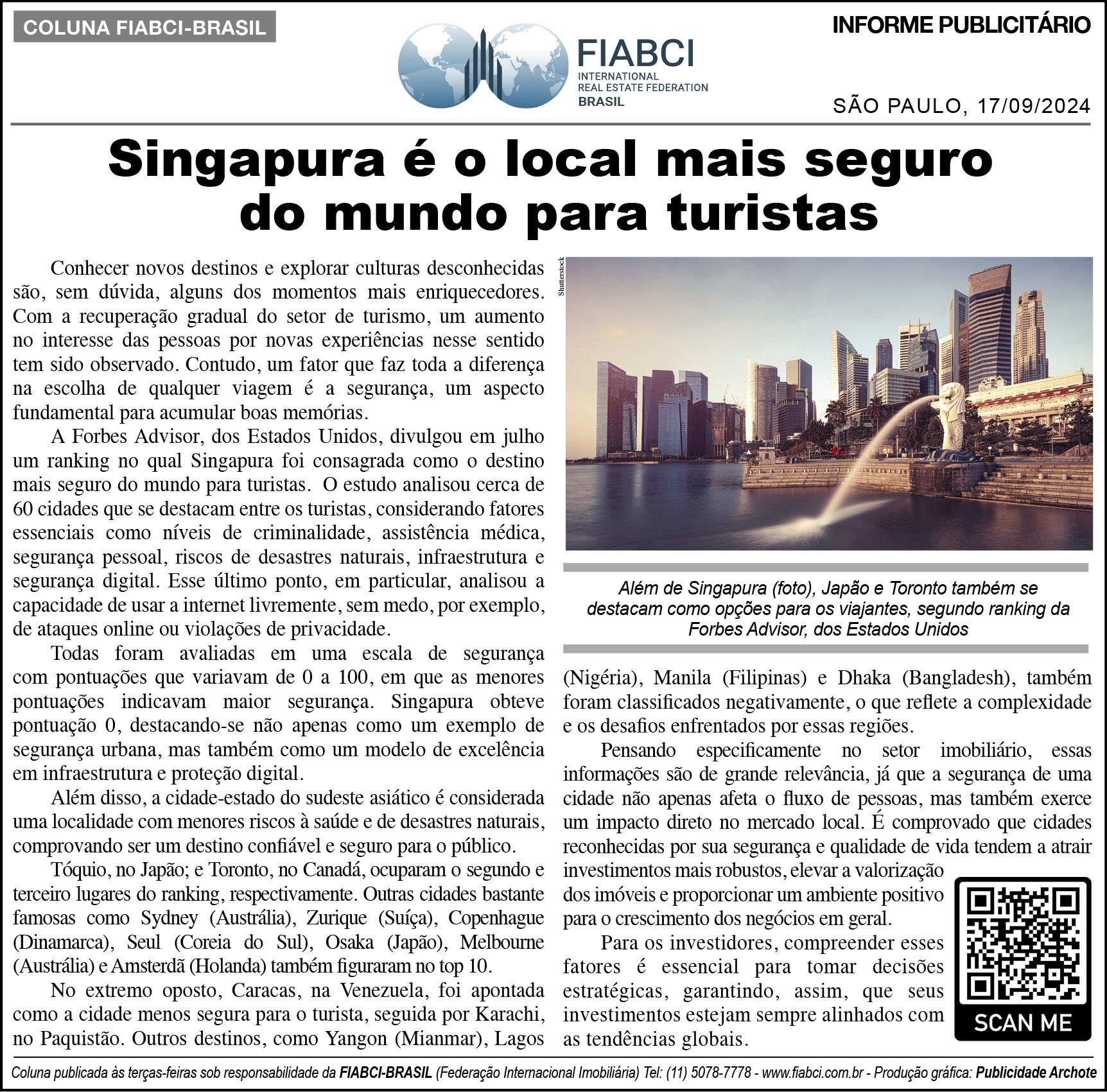"Singapura é o local mais seguro do mundo para turistas" - O Estado de S.Paulo - Cad. Economia & Negócios - pág. B4.