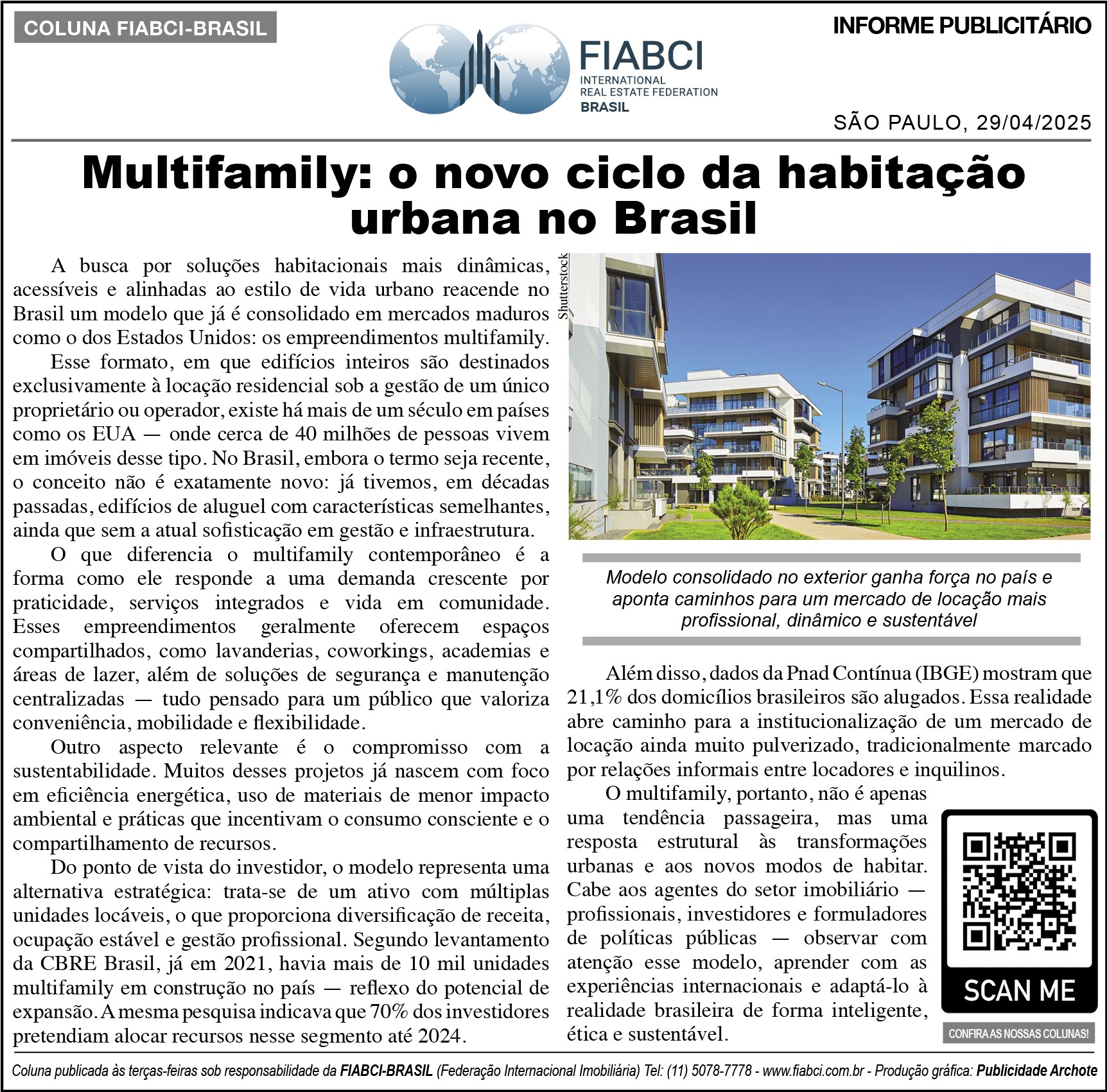 "Multifamily: o novo ciclo da habitação urbana no Brasil" - O Estado de S.Paulo - Cad. Economia & Negócios - Pág.B6.