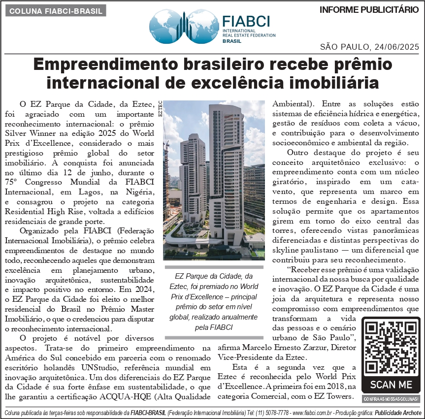 O EZ Parque da Cidade, da Eztec, foi agraciado com um importante reconhecimento internacional: o prêmio Silver Winner na edição 2025 do World Prix d’Excellence, considerado o mais prestigioso prêmio global do setor imobiliário. A conquista foi anunciada no último dia 12 de junho, durante o 75º Congresso Mundial da FIABCI Internacional, em Lagos, na Nigéria, e consagrou o projeto na categoria Residential High Rise, voltada a edifícios residenciais de grande porte.