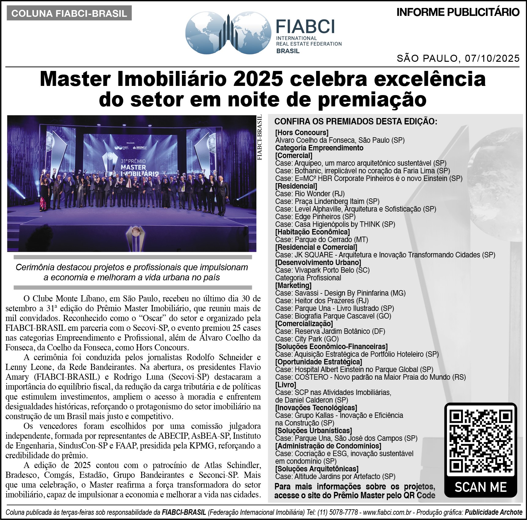 "Master Imobiliário 2025 celebra excelência do setor em noite de premiação" - O Estado de S.Paulo - Cad.Metrópole- Pág.A18.