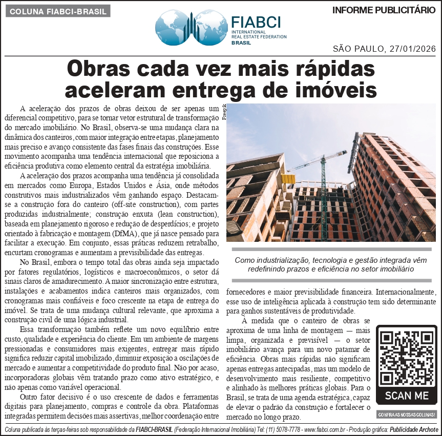 À medida que o canteiro de obras se aproxima de uma linha de montagem — mais limpa, organizada e previsível — o setor imobiliário avança para um novo patamar de eficiência. Obras mais rápidas não significam apenas entregas antecipadas, mas um modelo de desenvolvimento mais resiliente, competitivo e alinhado às melhores práticas globais. Para o Brasil, é uma agenda estratégica, capaz de elevar o padrão da construção e fortalecer o mercado no longo prazo.