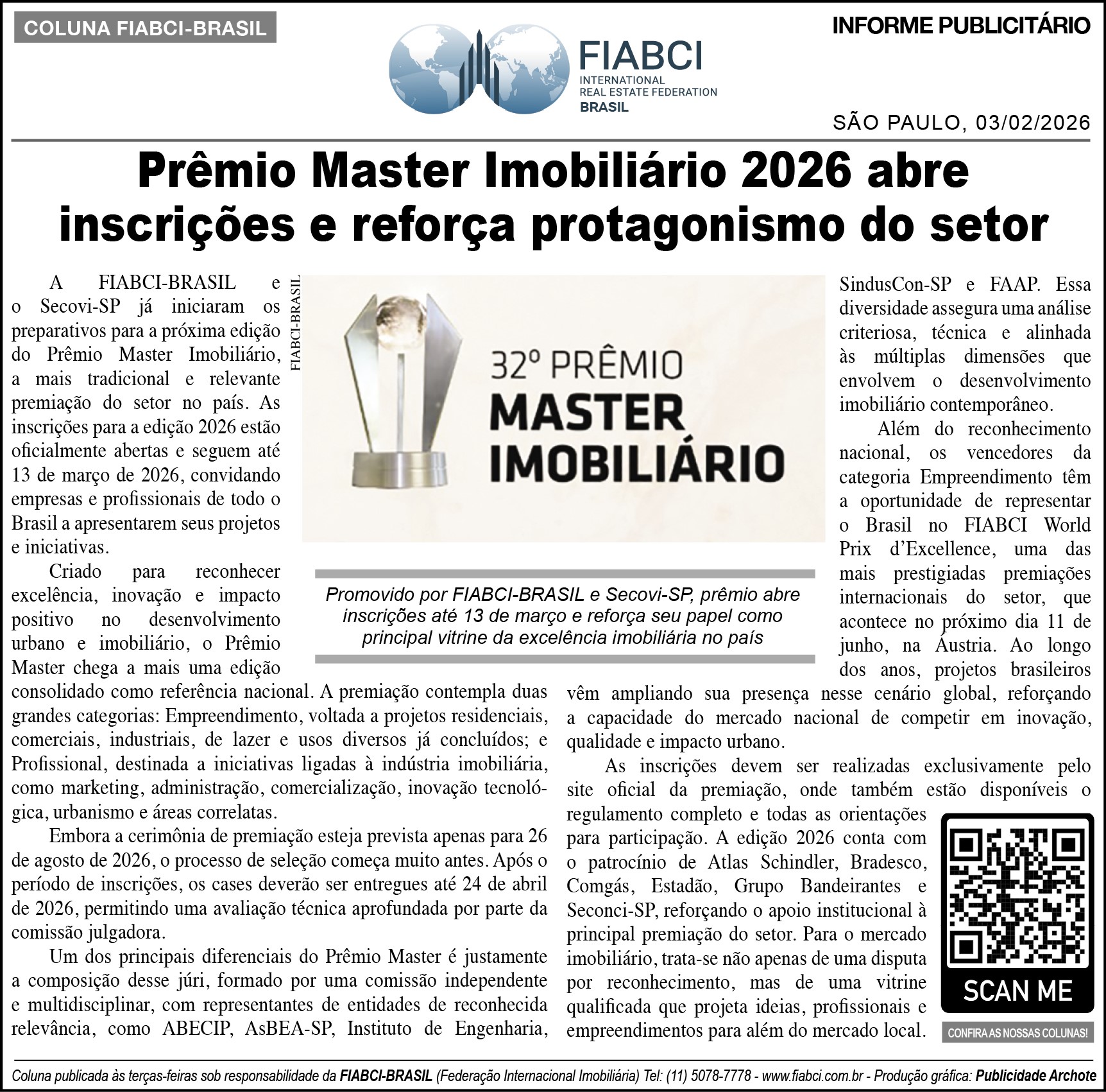 "Prêmio Master Imobiliário 2026 abre inscrições e reforça protagonismo do setor" - O Estado de S.Paulo - Cad. Economia & Negócios - Pág. B2.