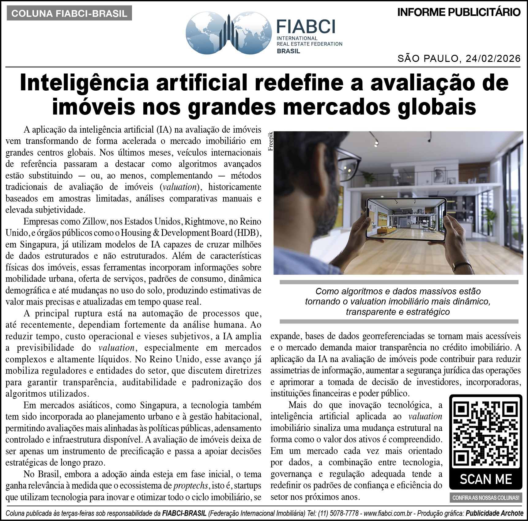 "Inteligência artificial redefine a avaliação de imóveis nos grandes mercados globais" - O Estado de S.Paulo - Cad. Negócios - Pág. B14.