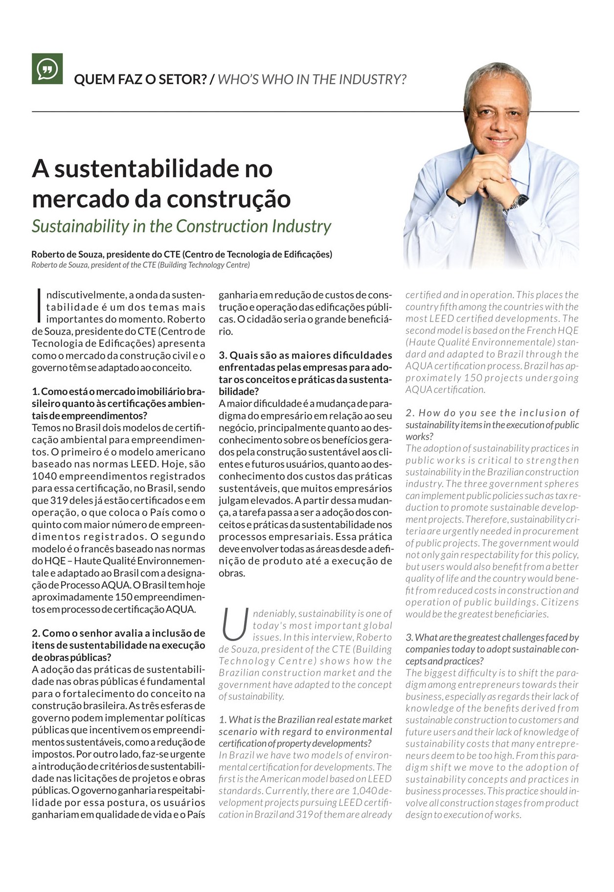 Este mês no Fiabci Hoje, Roberto de Souza, presidente do CTE fala sobre s sustentabilidade no mercado da construção