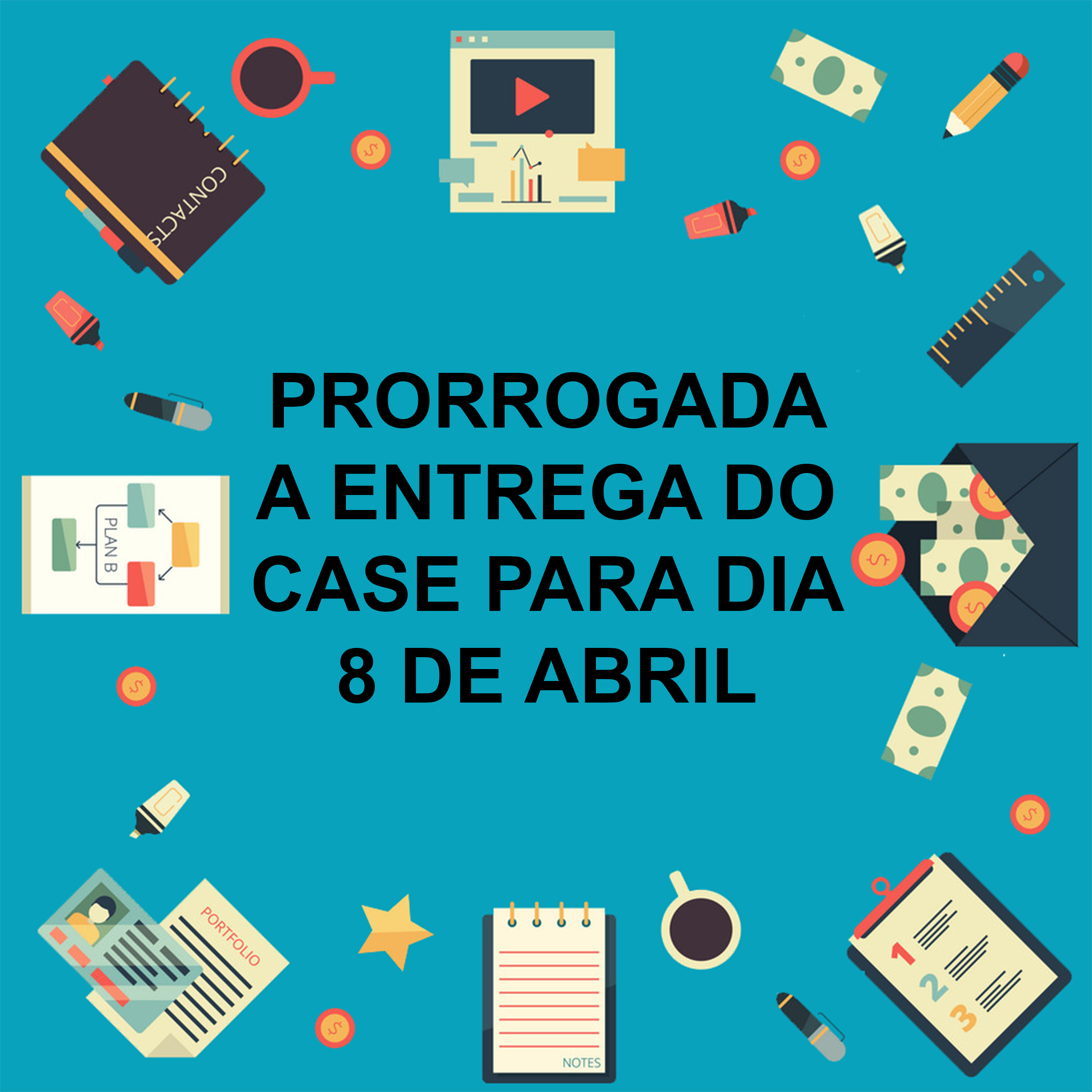 Prorrogamos o prazo de entrega dos cases para avaliação para o dia 8 de abril, devido aos feriados antecipados na cidade de São Paulo. Aproveitem o prazo extra e caprichem!