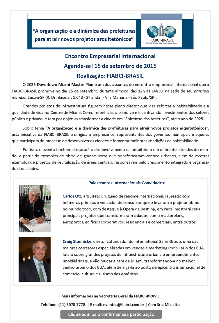 Evento FIABCI-BRASIL, 15 de setembro, sobre os grandes projetos arquitetônicos do Arq. Carlos Ott e a transformação de Miami, EUA
